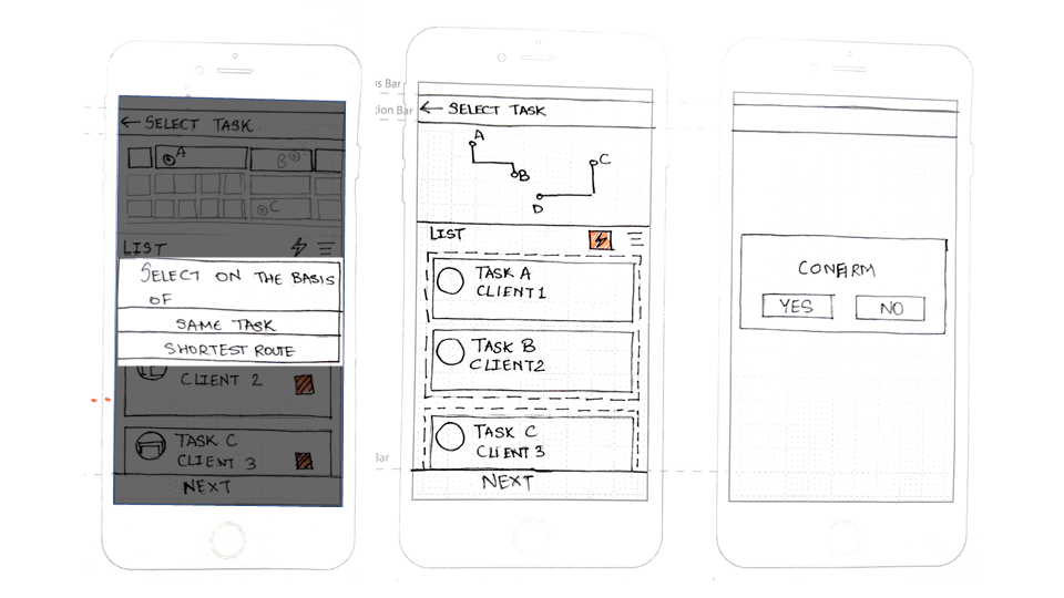 I created low fidelity wireframes on the basis of the hypothesis due to dynamic interlinking between two aspects – whether a team is created first or clients are selected first.